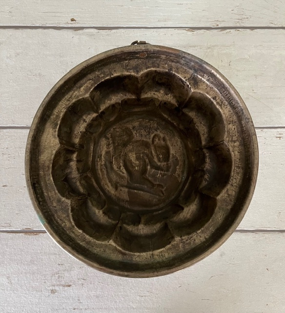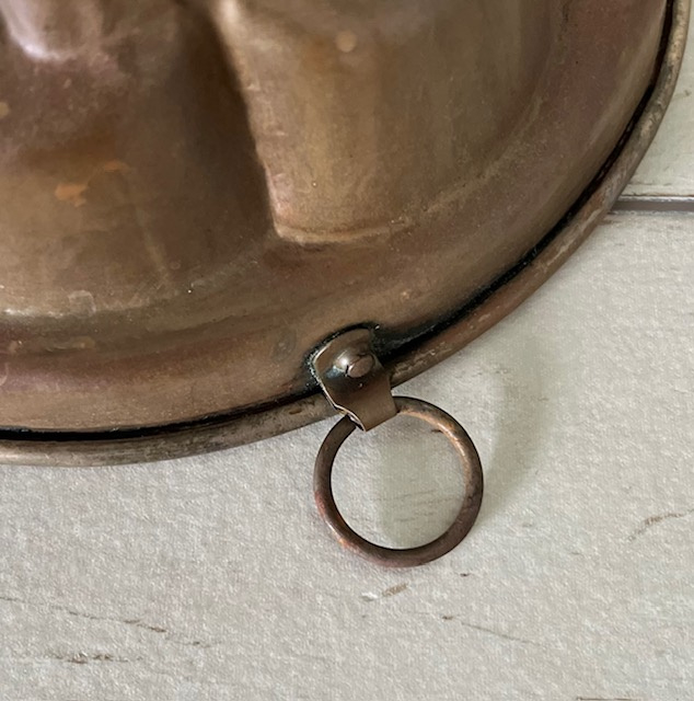 32245. Niet opgepoetst, dat kan altijd nog gedaan worden, maar dan duurt het heel wat jaartjes om de patina die hij nu heeft terug te krijgen. Voorzien van een ophang oog. Afmetingen: doorsnede 22 cm, hoogte 12 cm. Gewicht 400 gram.
