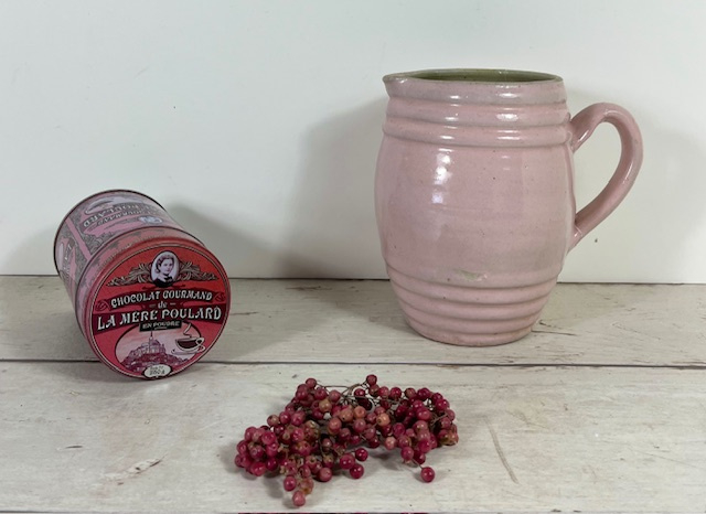 32186. Rijk Frans roze gedecoreerd blik voor cacaopoeder. Het blokje heeft een dubbele sluiting, zo bleef de cacaopoeder lang vers. Herkomst Mont Saint-Michel. Hoogte 12 cm, doorsnede 8 cm. Gewicht 100 gram.
