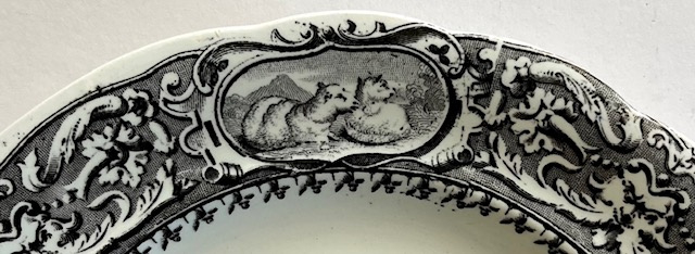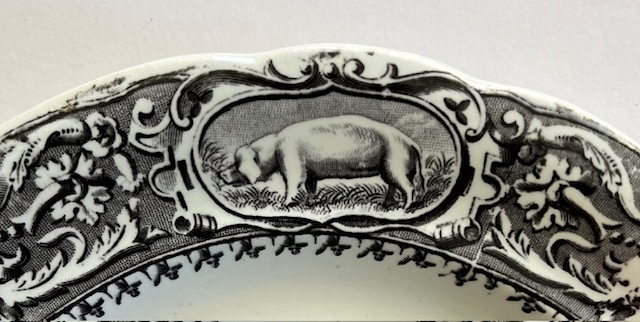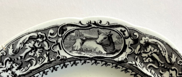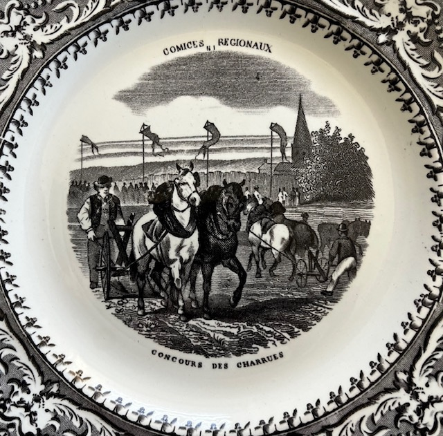32480. Médaille à l’Exposition Universelle de 1853. In nieuwstaat is dit bordje met koeien en paarden in zwarte opdruk. Concours de charrues comices regionaux n 1. Doorsnede 20 cm, gewicht 250 gram.