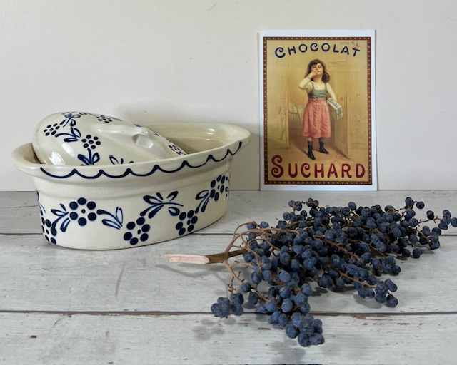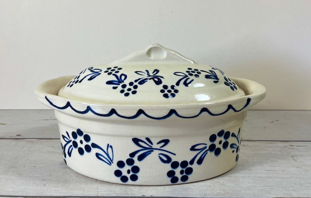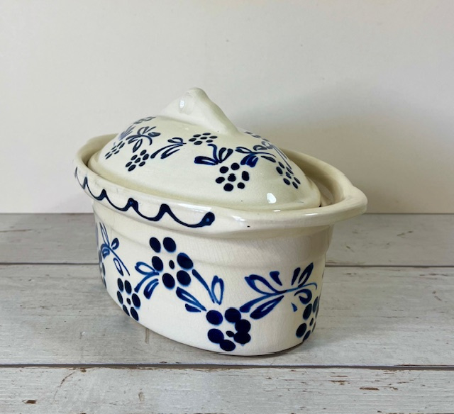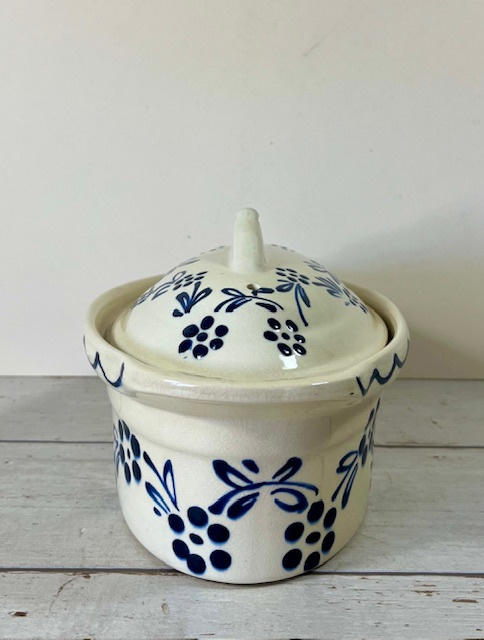 32615. Inhoud 1 liter. Prachtig in een landelijke keuken, unieke uitvoering. Handgemaakt, beschilderd en geglazuurd. In uitstekende vintage staat, zonder schade. Afmetingen: lengte 26 cm, breedte 15 cm, hoogte 14 cm (zonder deksel 9 cm). Gewicht 1440 gram.