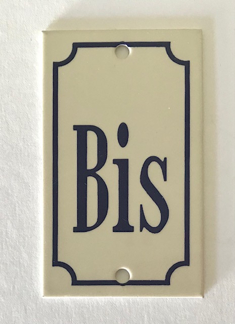 Frans geëmailleerd aluminium tekstbordje Bis crème / blauw