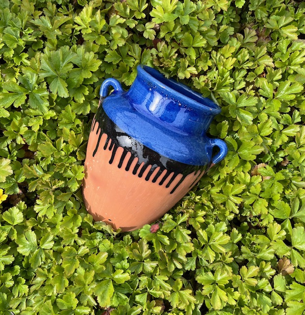Franse terracotta muurbloempot deels blauw geglazuurd32450. In zeer goede staat. Het blauwe glazuur loopt prachtig uit over de buit van de pot. Afmetingen: hoogte 27 cm, diepte 16 cm, breedte 22 cm. Gewicht 1500 gram.
